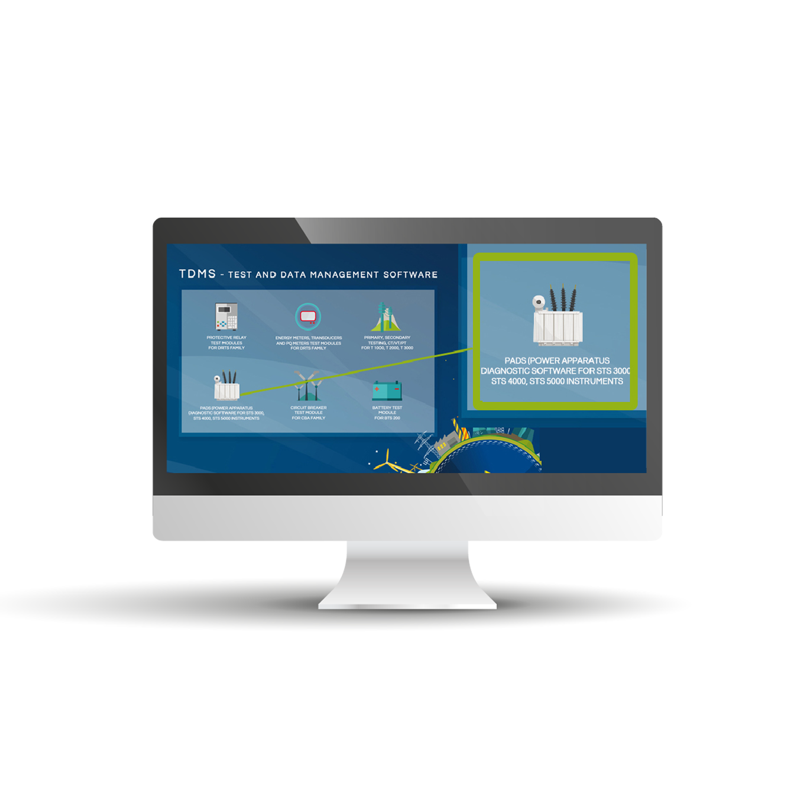 Power Apparatus Diagnostic SoftwarePADS is an optional module of the Test & Data management software (TDMS), that allows the remote control of STS 5000, STS 4000 and e-KAM. These devices allow performing tests of: CTs, VTs, PTs, CBs and almost all other power devices in electrical substation..